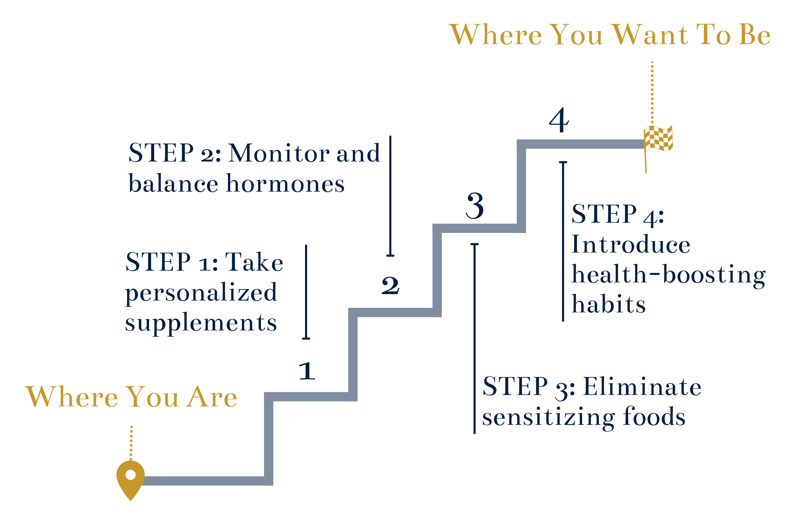 • STEP 1. Take personalized supplements to support your body's hormone balance, gut health, stress response, and detoxification pathways.